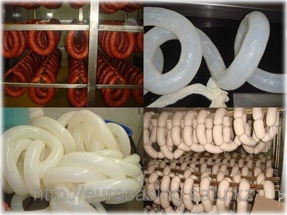 - 1. Коллагеновые колбасные оболочки. Изготовлены из коллагена, извлекаемого из спилка говяжьих шкур. Наиболее близки к натуральным оболочкам по технологическим и органолептическим показателям. Из коллагена делают любые диаметры оболочек - сосисочные (18-26 мм), сарделечные(28-34 мм), колбасные (36-45 мм). Разделяются эти оболочки на 2 вида - прямые и кольцевые (полностью повторяют внешний вид черевы).